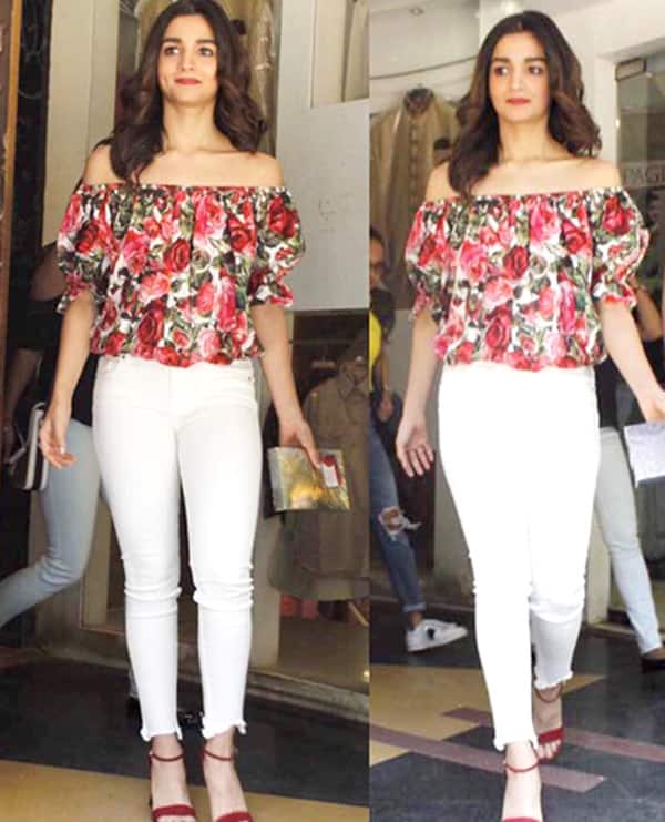 Wearing a floral off-shoulder top from Dolce & Gabbana, Alia paired it well with white skinny, cropped denims. She carried off the summery look sans accessories and a pair of crisp white stilettos from Charles & Keith. With her hair left down open in firm waves and sporting bright lips with a minimal makeup, Alia made us fall in love with her summery look.